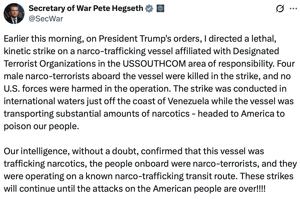 Secretary of War Pete Hegseth says that these strikes will continue “until the attacks on the American people are over”…