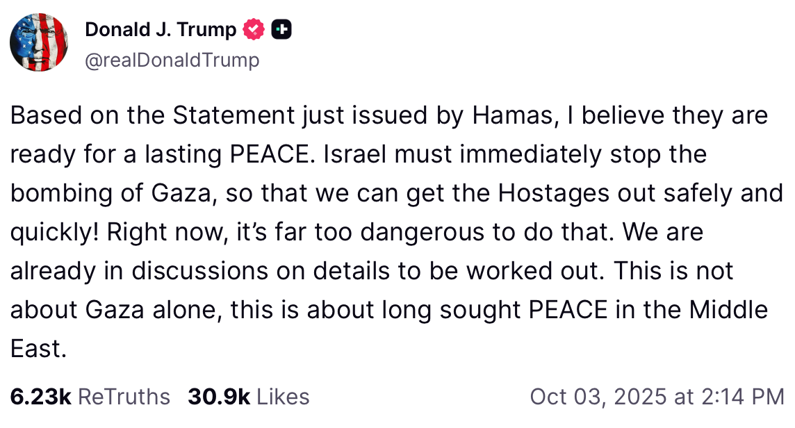 US President Donald Trump demanded Israel stop bombing Gaza “immediately” after Hamas said on Friday night it is willing to release all hostages in an effort to re-enter negotiations over Trump’s deal to end the war in Gaza.