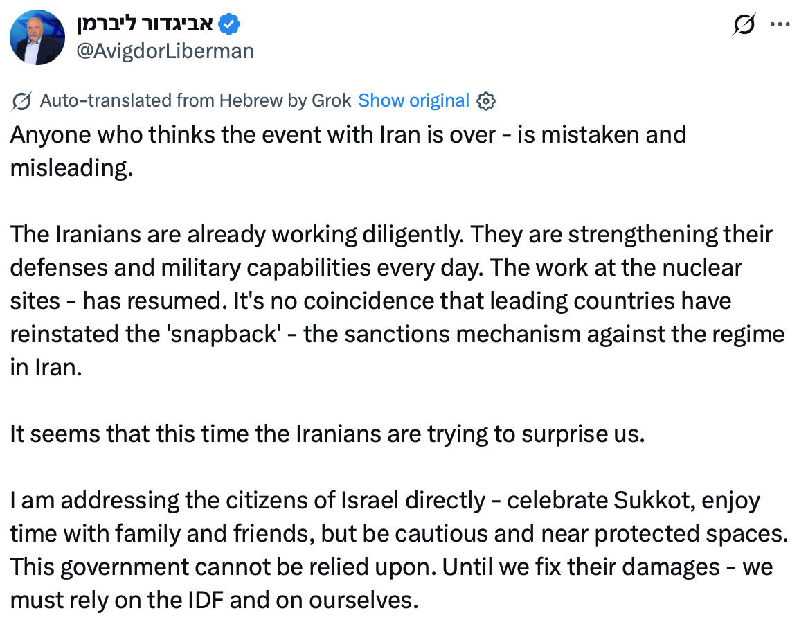 And Israeli politician Avigdor Liberman is warning Israelis to stay near protected spaces during Sukkot…