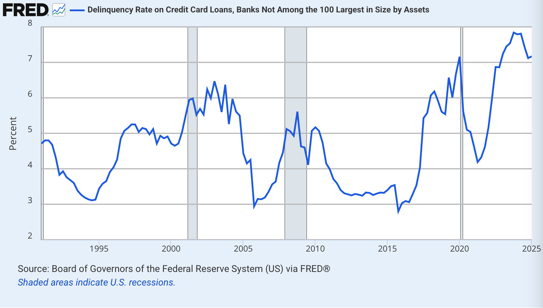 For some perspective, let’s go back to the end of 2024. At that time, it was being reported that “credit card loan defaults soared this year”…